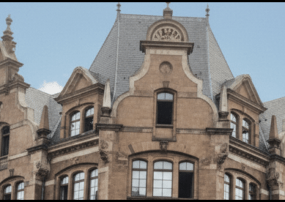 Zeitgenössische Fotografien und Postkarten zeigen den ursprünglichen Zustand mit hohen Dachaufbauten, Ziergiebeln und steilen Dächern.