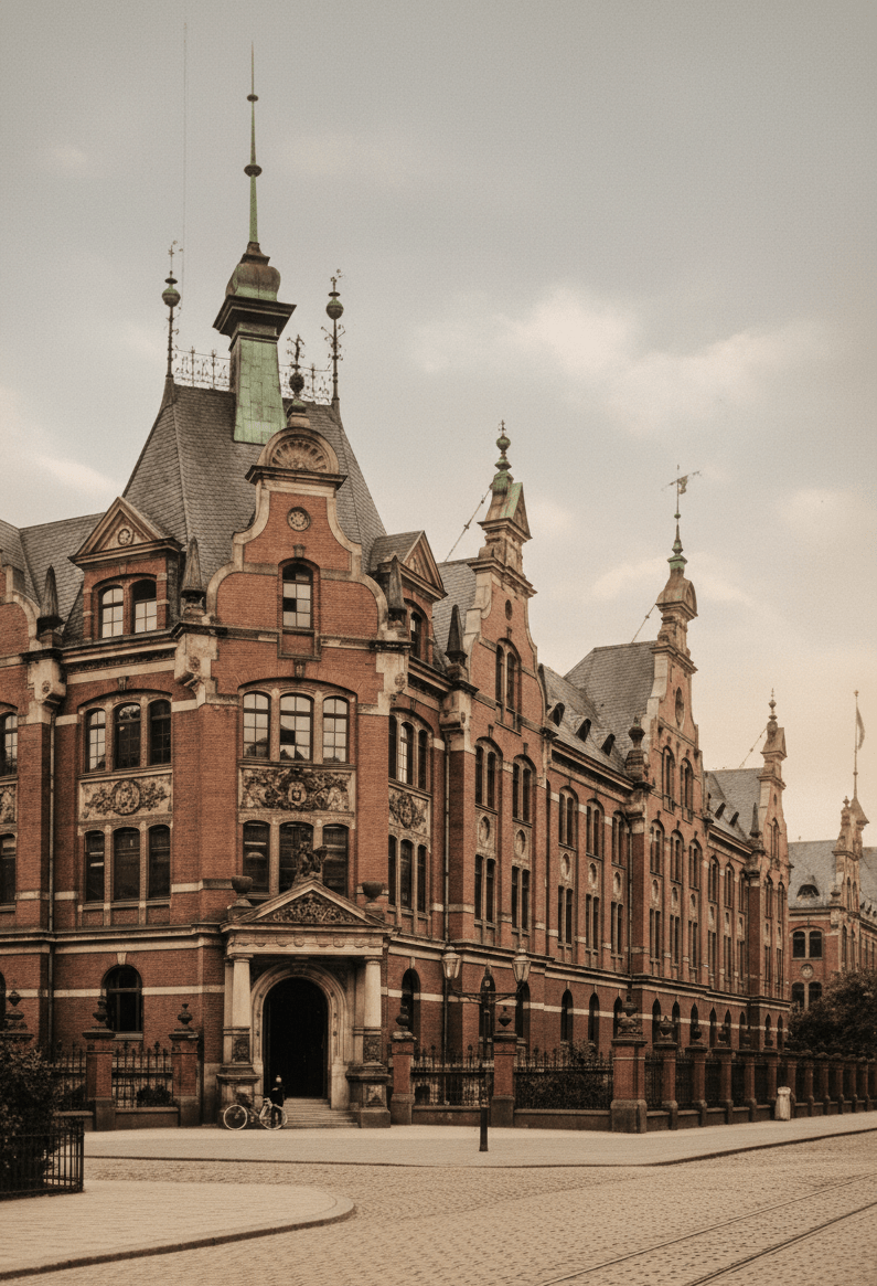 Der Gebäudekomplex wurde zwischen 1891 und 1893 errichtet. Die Architektur folgt der staatlichen Verwaltungsbauweise der wilhelminischen Zeit und orientiert sich formal an der Neorenaissance. Verwendet wurdender typische roter Backstein und heller Sandstein.